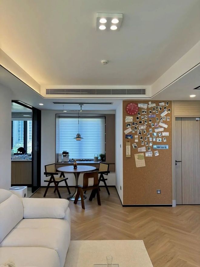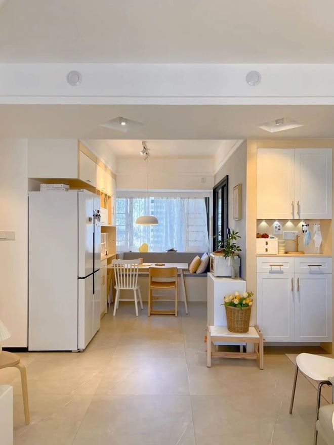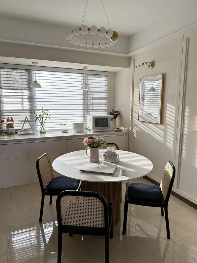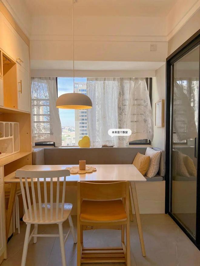 本来认为飘窗是小户型的硬伤,没想到它却成了我的“救命稻草”。47cm高的窗台+5cm的坐垫,再调配一张餐桌,摇身一变就成了一个卡座式用餐区。