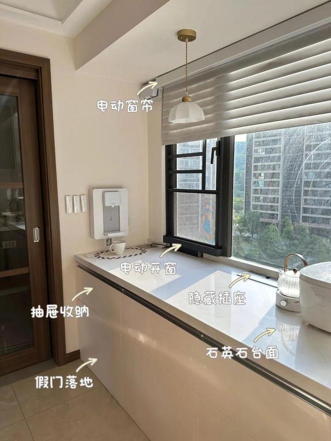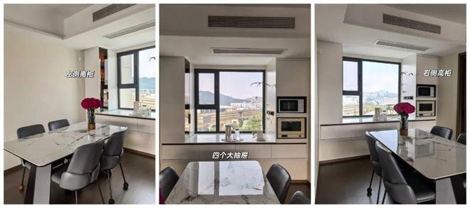 后来想着这个飘窗也没啥用,就抛弃了餐边柜,并在飘窗台上做了四个大抽屉以及石英石台面,将其改成了西厨操作台。
