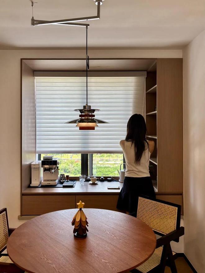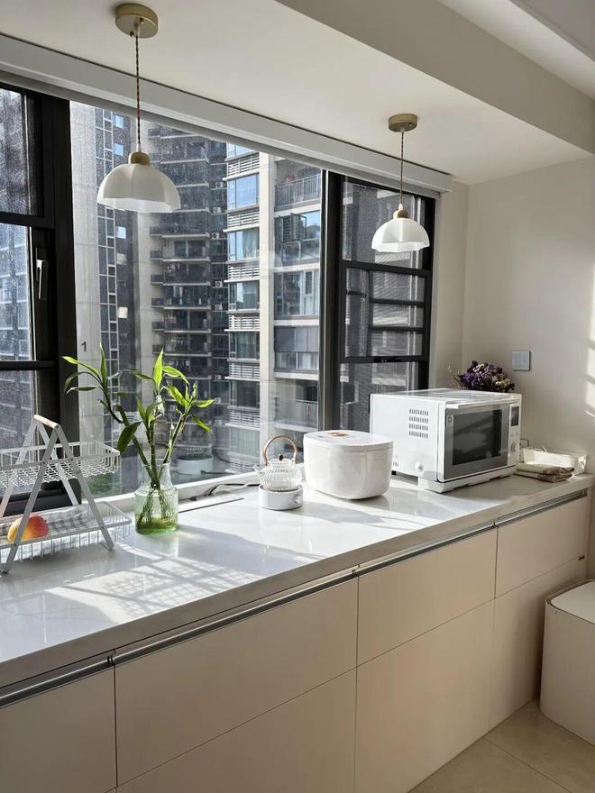 到底是谁在说餐厅飘窗台很鸡肋?把它改成水吧台莫非不香吗?45cm的飘窗+25cm的抽屉柜,全体高度刚刚好。